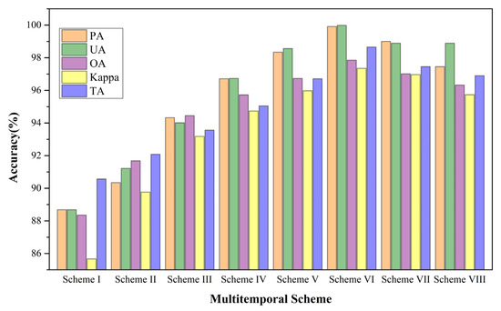 Different schemes are designed by gradually accumulating bands of each score segment. As shown in Table 3, eight different kinds of multi-temporal schemes were designed as follows: Scheme I: choose the top 3 bands in importance, involving two months (February and April); Scheme II: choose the top 5 bands in importance, involving three months (February, April, and December). Scheme III: choose the top 8 bands in importance, involving four months (February, March, April, and December); Scheme IV: choose the top 15 bands in importance, involving five months (January, February, March, April, and December); Scheme V: choose the top 21 bands in importance, involving six months (January, February, March, April, September, and December); Scheme VI: choose the top 39 bands in importance, involving all months except July and October; Scheme VII: choose the top 61 bands in importance, involving all months except October; Scheme VIII: all 110 bands were selected, involving all months.