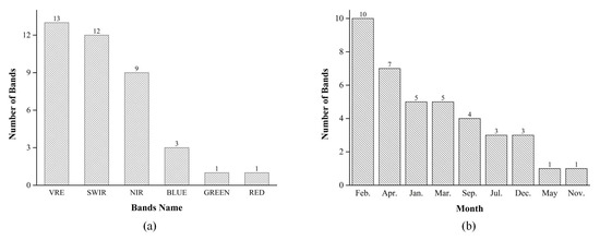 Figure 10b depicts the variation in the number of months in Scheme VI. It can be seen that all 10 bands of February are in Scheme VI’s 39 bands, accounting for 25.6%, indicating that for garlic, the contribution of February to garlic extraction is the highest, which is similar to the mono-temporal result. In addition, the seven bands of April are among the 39 bands in Scheme VI. The number of bands in April account for a more significant proportion (17.9%). This is because garlic is in the bolting stage and has a blue-green color, whereas winter wheat are in the booting stage and have a dark black or dark green color, which is easy to distinguish.