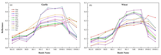 The reflectance of each month in various bands. (a) Garlic and (b) wheat.