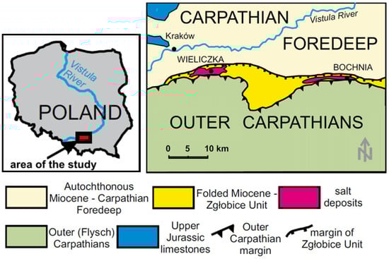 The most distinguishing feature of the site is its geological position—at the contact zone of two large tectonic units: the Carpathian Foredeep Basin and the Outer Carpathians (Figure 1). The shape of the salt deposit was formed in response to the forces and mechanisms that control salt flow and it reflects its turbulent geological history []. During the Late Miocene epoch, evaporite formations were folded in front of the Carpathian nappes, and then they were moved northward and thrust from the south over the autochthon [,,,]. Evaporate formations occur there as a belt of about 12 km in length along the border of the Carpathian overthrust, and the maximum width of the deposit is 200 m [,].
