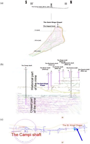 Location of the Saint Kinga Chapel (site of the measurement) in The Bochnia Salt Mine: (a) geological cross section of the Bochnia salt structure, (b) cross section illustrating the salt mine, (c) a situational sketch of the area of the measurements.