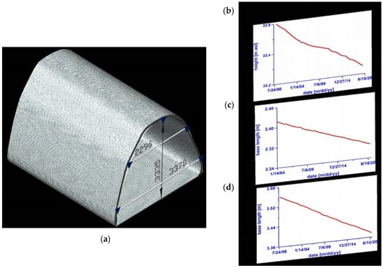 Scheme illustrating benchmarks used for displacements and convergence measurements at the entrance to the Saint Kinga Chapel. On the right: (a) temporal distribution of vertical displacements of the roof benchmark, (b) convergence of the upper base line (2296 mm), (c) convergence of the lower baseline (3378 mm), (d) convergence of height baseline (3335 mm).
