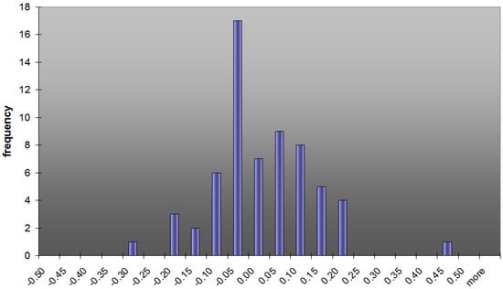 In the next step of the analysis, absolute value was not taken (the signs of the errors were not removed), and the average error became the Mean Bias Error (MBE), which was intended to measure the average model bias. The MBE value amounted to −0.02 mm, which was even better. The obtained values are presented on Figure 7 in the form of a frequency plot. It may be seen that the results turned out to be very promising for further research.