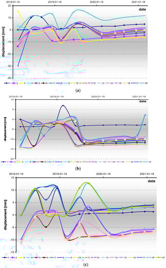 The total displacements were analyzed, which are defined here as being the difference between the initial position of each individual point (determined in the first measurement series in 19 January 2018) and its final position (determined in a particular measurement series). The changes referred to in the first results reflect a displacement process of the points (Figure 8). However, the distribution presented in the chart reflects some disturbances (jump values), but the trend is visible in all measurement baselines. After a rejection of the disturbances, linear trends were calculated and the annual rate of displacement of each point was estimated and average model-performance errors were examined.
