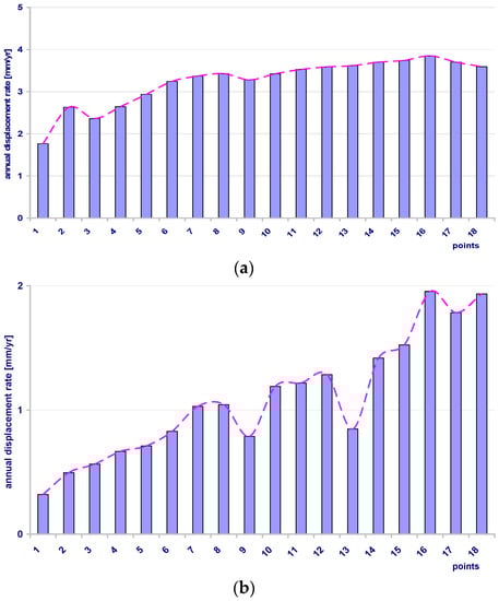 The higher displacements of the points in the roof part of intact rocks surrounding the excavation correspond to observed convergence. The differentiation of the displacements observed in the southern and the northern parts of the rock mass is not justified in the mining situation, as it could be understood as being the effect of galleries or chambers that could affect the deformation process (see map in Figure 2). Moreover, the distributions of the points’ rates along the length of each baseline are quite different. These differences are outlined in Figure 9. The distributions are similar on the R and the N, but the values are different, and twice as large on the R baseline. Both of the baselines demonstrated a presence of a very even distribution with little variation in the rates along the baseline line. On the S baseline the values increase steadily and linearly with increase of the distance from the point 0. This suggests the occurrence of additional effects influencing the natural process of convergence. Summarizing, the S baseline demonstrates the displacements of the points at which average annual rate values are at their smallest, but where they are also at their most diverse. This diversity is not chaotic but presents a linear increase according to the distance from the reference point (sidewall of the excavation).