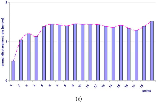 Annual displacements rates of points since 2018-01-19 in measurement baselines: (a) R (roof), (b) S (southern side wall), (c) N (northern side wall).