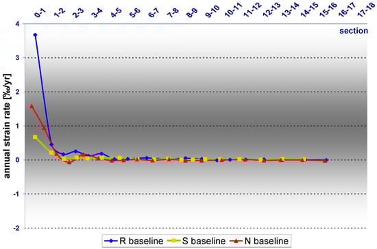 The rate of displacement of each point was estimated and average model-performance errors were examined. The results are presented in Table 2. In contrast to the MAE values calculated for the displacement, the value of MAE calculated for the strain rates were found to be an order of magnitude smaller. The distribution of the strain rates in time for each section of each baseline is actually linear, but here we are dealing with a different distribution of the values for each individual baseline. The average annual rate (AAR) estimated for the baselines are different and they are as follows: 0.28‰/year for the R baseline, 0.08‰/year for the S baseline and 0.15‰/year for the N baseline.