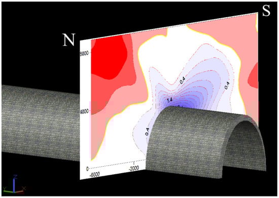 Based on the results of the strain rates calculated for each point of all the baselines and assuming their spatial positions, a map of their distribution in the plane of the baselines was made. Data interpolation was performed in relation to the geometry of the radially diverging lines around the excavation. A visualization of the distribution in the form of a map, spatially oriented with respect to the excavation (the August passage), is presented on Figure 11. This visualization clearly demonstrates a strain distribution and, in fact, a stress field. It is noticeable that the southern part of the intact rocks mass surrounding the August passage is more compressed. This disturbance in the unexpected symmetry reflects presence of some additional force acting in the deformation.