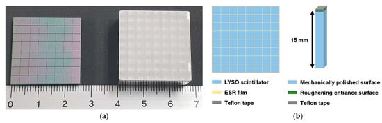 Figure 2b shows the design of the LYSO array. To achieve excellent CTR, each LYSO was mechanically polished except for a roughening entrance surface. All lateral surfaces and the entrance surface of the LYSO were optically isolated by ESR film and Teflon tape, respectively. In addition, all lateral surfaces of the LYSO array were optically isolated by Teflon tape [16].