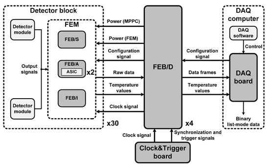 The individual channel readout electronics were based on a 64-channel commercial ASIC (TOFPET2, PETsys Electronics S.A., Oeiras, Portugal) to enable fast TOF measurement [28]. Figure 3 shows a block diagram of the individual channel readout electronics for the developed TOF brain PET. They were composed of the FEM, a front-end board (FEB) for data acquisition (DAQ) called FEB/D, a DAQ board, and a Clock&Trigger board.