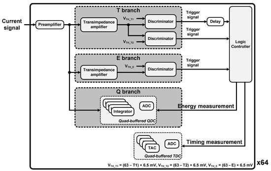 As shown in Figure 4, it consisted of a preamplifier, two transimpedance amplifiers, three fast discriminators, a quad-buffered charge-to-digital converter (QDC), and a quad-buffered dual ramp time-to-digital converter (TDC) for each channel [30]. The output current signal of the detector module passed through the preamplifier, a current conveyor with low input impedance, and was then replicated to three branches: T, E, and Q. The current signals of the T and E branches were converted into voltage signals by transimpedance amplifiers, and that of the Q branch was digitized by the QDC comprising four integrators and a 10-bit Wilkinson analog-to-digital converter (ADC) for energy measurement.