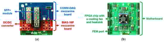 Figure 5 shows FEB/D comprising a motherboard, a BIAS-16P mezzanine board, and a COMM-DAQ mezzanine board [29,31]. The motherboard was equipped with a field programmable gate array (FPGA) chip, and eight FEM ports for operating up to eight FEMs through 50 cm-long flexible flat cables. The role of the motherboard was to distribute power, clock, and configuration signals to each FEM, to receive temperature values and raw data on the ASIC from each FEM, and to collect raw data into data frames, as shown in Figure 3. The motherboard only required a single external supply voltage of 12 V with a maximum current of 4 A and used a set of switching regulators to supply power to eight FEMs as well as the entire FEB/D.