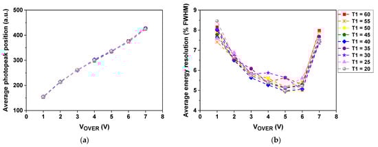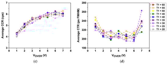 Figure 8 shows average values of the photopeak position, energy resolution, CCR, and CTR measured using a pair of channels at different VOVER and T1 values. The average photopeak position was almost linearly shifted to higher QDC values with increasing VOVER value, regardless of the T1 value (Figure 8a). The average energy resolution gradually improved as the VOVER value increased, but rapidly deteriorated after the VOVER value of 5–6 V (Figure 8b). The average CCR increased, but the rate of change gradually decreased as the VOVER value increased (Figure 8c). In addition, like the average energy resolution, the effect of the T1 value on the average CCR was relatively small. The average CTR improved as the VOVER value increased, but rapidly deteriorated after the VOVER value of 5–6 V (Figure 8d). At the VOVER values of 5 and 6 V (T1 = 30), the average CTRs were 195.5 ± 9.2 and 194.7 ± 12.1 ps FWHM, respectively.