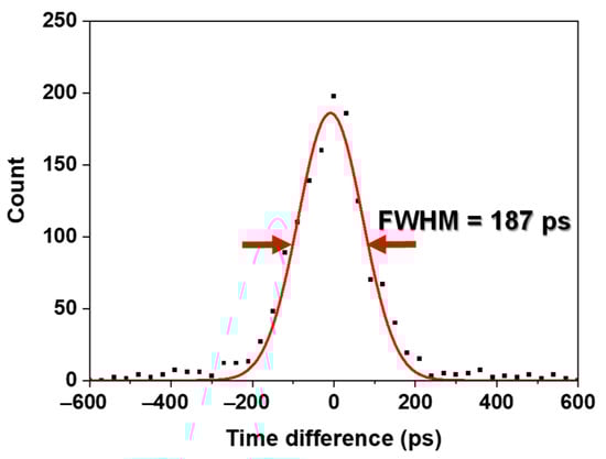 The optimal VOVER and T1 values were determined to be 5 V and 30, respectively, considering the standard deviation of the CTR. The average values of the photopeak position, energy resolution, and CCR were 335 ± 3, 5.6 ± 1.4% FWHM (without energy nonlinearity correction), and 6.1 ± 0.2 cps, respectively at the optimal values. The best CTR of 187 ps FWHM was achieved, as shown in Figure 9.