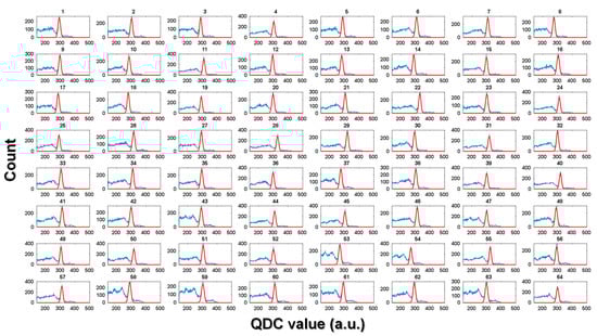 Representative energy spectra acquired from 64 channels of the TOF brain PET. The thick solid lines were the result of applying a Gaussian fit to the photopeak position corresponding to 511 keV.