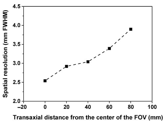 It was possible to clearly distinguish all rods in the tomographic image of the hot-rod phantom and the diameter of the smallest among these was the same as the transaxial spatial resolution measured at the center of the FOV. As shown in Figure 11, the spatial resolution of the developed brain PET was degraded toward the outside of the FOV due to an increase in parallax error caused by the reduced ring diameter [3,6]. If TOF technology is applied, it is predicted that the degradation of the spatial resolution can be improved due to allowing the use of smaller voxels in the image reconstruction [14]. In addition, it is expected that the image quality will be greatly improved due to excellent CTR.