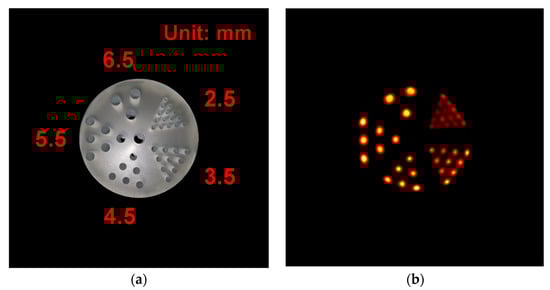 (a) Photograph of the hot-rod phantom comprising 40 rods with different diameters (2.5, 3.5, 4.5, 5.5, and 6.5 mm). (b) Transverse slice of the hot-rod phantom image acquired using the TOF brain PET.