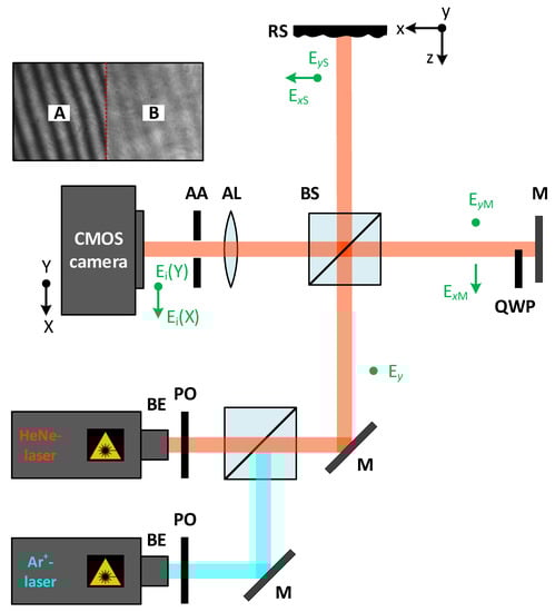 In order to ensure the initial polarization conditions, the collimated and expanded laser beam goes through a polarizer (PO). The used light source is a red HeNe-laser head (THORLABS) with the main laser line and an output power of , in addition to an Ar+-laser head (LEXEL 3500) with a laser line of the wavelength and a wavelength-dependent single-line power of , respectively. The laser is applied in a single longitudinal operation. The Ar+-laser head is operated via an etalon (model LEXEL 3503). The 50:50 non-polarizing beam splitter (BS) splits the beam into an object path and a reference path. The laser beam, linearly polarized in the y direction, is directed onto the tilted plane mirror (M) in the reference path, where a quarter-wave plate is placed in one of the two halves, which we call part B (the other half without QWP is called part A). The plane mirror is slightly tilted in order to obtain interference fringes on the camera. The optical axis of the QWP is set to to generate, firstly, the circular polarized light [31,32]. This allows having the two necessary and different polarization states of the reference beam, which provide distinct information on part A and part B by the CMOS camera (Photonfocus) with a pixels resolution and an pixel size corresponding to a resolution of . It would be the same as having two Michelson interferometers integrated into one system. This setup was simplified by the QWP, which makes it, e.g., more space-saving. Simultaneously, the rough surface (RS) in the object path scatters the laser light, generating various interferometric fringe patterns on the two halves A and B of the camera. The achromatic lens (AL) with a focal length of and the adjustable aperture (AA) produce a sharp image of the object and reference the camera. The magnification of the measuring system is .
