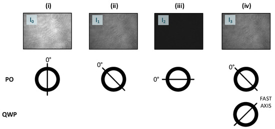 The generation of the Stokes parameters , , , and to determine the degree of polarization (DOP) (with the adjustments of the polarizer (PO) and the quarter-wave plate (QWP) for each measurement): (i) capture of the intensity (first measurement); (ii) capture of the intensity (second measurement); (iii) capture of the intensity (third measurement); (iv) capture of the intensity (fourth measurement) (measurement pictures of a surface with the RMS roughness (see Sample 2 in Table 1) at a wavelength of ).