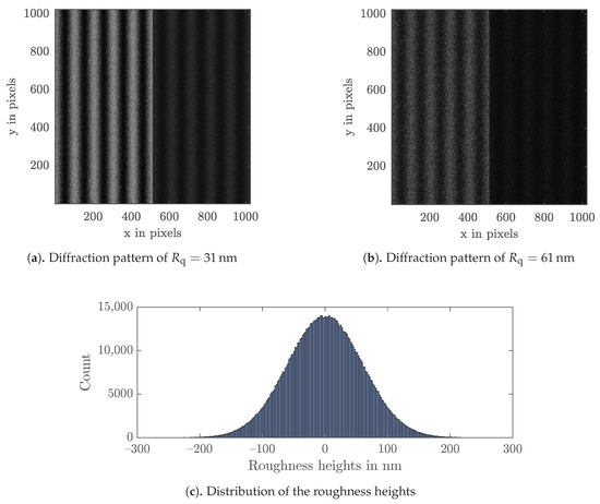 First, by considering the two components of the diffracted field from the sample , the total intensity is simulated. Considering that these two electric fields are uncorrelated, the total intensity on the detector for this step of the procedure is the addition of the intensities associated with both components similarly to independent phenomena, that is . As a second step, the total intensity of the reference is modeled by simply regarding the plane wave from the mirror . For the interferometric fringe pattern simulation with the two different contrasts and , both paths of the interferometer setup are considered. Thus, the two fields and on part A, and and on part B, interfere independently, resulting in two speckle fringe patterns. This is also clearly visible in the simulated interferograms for two exemplary roughnesses of and , with the two contrasts (left in Figure 3a,b) and (right in Figure 3a,b), where a wavelength of was assumed. Figure 3c shows the corresponding Gaussian distribution of roughness deviations from the mean height.