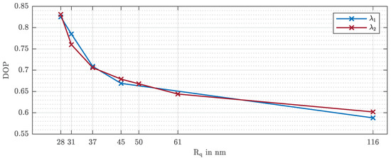 In order to measure the depolarization and to be able to quantify the portion of light polarized by the rough sample, the degree of polarization for each of the seven samples was also determined. In order to avoid some problems derived from the surface anisotropy, different areas were measured and the results averaged. The measured degrees of polarization (DOPs), evaluated according to Equation (7), for the wavelength [21] and the wavelength are graphically shown in Figure 4. As expected, the DOP values for both wavelengths decrease with increasing roughness since a higher microscopic roughness depolarizes more light. Since the Stokes’ parameters , , , and differ slightly for different wavelengths and the DOP is theoretically defined as the quotient of the Stokes’ parameters, the curves in Figure 4 have small deviation with respect to each other.