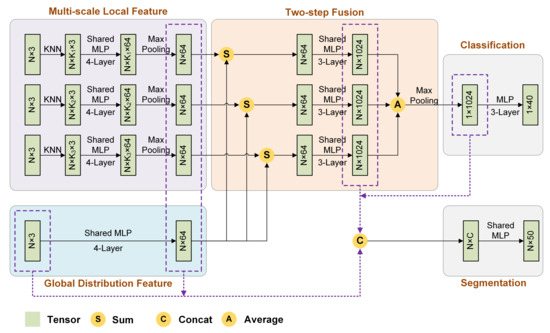 As shown in Figure 3, the proposed architecture mainly contains four modules. The “multi-scale local feature” module applies multiple weight-shared branches to extract multi-scale features in parallel. The “global distribution feature” module is used to extract the global distribution characteristics shared by each local scale. The local features of each scale are added with the global feature and then fed into the “two-step fusion” module to be further transformed. Like the “multi-scale local feature” module, the fusion module comprises several parallel branches with shared weights and generates multiple abstract features. Then, these features are averaged, and a max-pooling operation is performed to fuse them further; finally, a shape-level feature with high representativeness is obtained. The remaining “classification” or “segmentation” module is used for classification or segmentation tasks and outputs predictions.