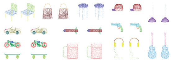 - Wu, Z.; Song, S.; Khosla, A.; Yu, F.; Zhang, L.; Tang, X.; Xiao, J. 3D ShapeNets: A deep representation for volumetric shapes. In Proceedings of the 2015 IEEE Conference on Computer Vision and Pattern Recognition (CVPR), Boston, MA, USA, 7–12 June 2015; pp. 1912–1920. [Google Scholar]