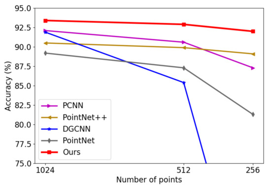 The experiments above prove that the proposed structure can achieve outstanding performance with 1024 points, but the points are not always sufficiently dense in actual scenarios. Thus, the capacity to extract features with sparse points is vital. To evaluate the performance with sparse points, we randomly sampled points from the 2048 points. We set the numbers of points to 1024, 512, and 256, and set the multi-scale to (12, 24, 36, 48), (6, 12, 18, 24), and (3, 6, 9, 12) according to the proportional relationship to keep the local region sizes unchanged. The results are shown in Figure 6. Our model outperformed other methods at each density by a large margin. The result proves that our model can still extract discriminative features with the proposed feature fusion strategy, even with sparser points.