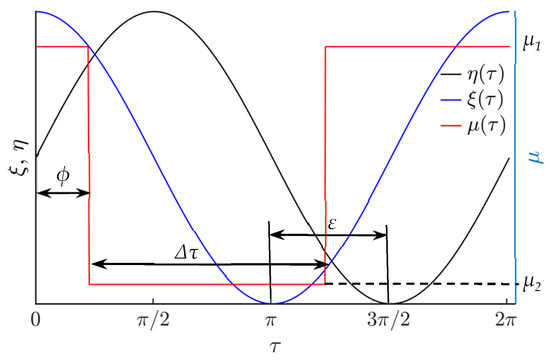 where n = (0, 1, 2, …), µ1 is the nominal dry friction coefficient between the platform surface and the part, µ2 is the dynamically reduced effective dry friction coefficient, ϕ is the phase shift between the function for dynamic dry friction control and the function defining the circular motion of the platform, Δτ is the width of the rectangular function for dynamic dry friction control (Figure 2).