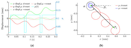 Displacement of the part when µ1 = 0.122, µ2 = µ1/8, g = 9.81 m/s2, Ae = 0.31 mm, ω = 62.8 rad/s, ε = π/2, ϕ = 0, Δτ = π/4: (a) displacement vs. time and the effective dry friction coefficient vs. time; (b) motion trajectory of the part and the angle of displacement α.