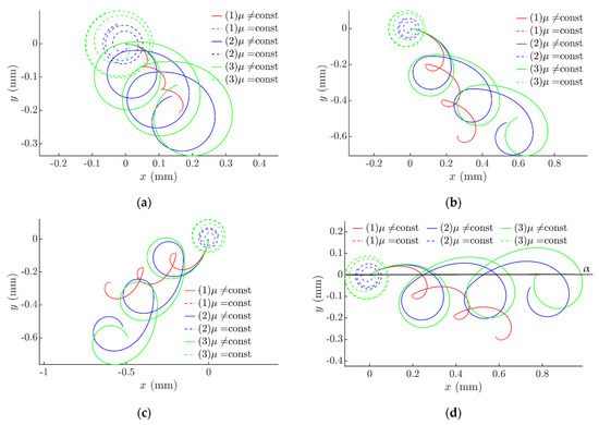 Trajectories of the part when µ1 = 0.122, µ2 = µ1/8, g = 9.81 m/s2, ω = 62.8 rad/s, ε = π/2; (1) Ae = 0.28 mm, (2) Ae = 0.31 mm, and (3) Ae = 0.32 mm; (a) ϕ = 0, Δτ = π/10; (b) ϕ = 0, Δτ = π/4; (c) ϕ = 11π/9, Δτ = π/4; and (d) ϕ = 17π/9, Δτ = π/4.