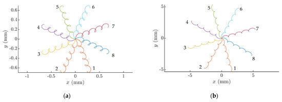 The angle of displacement α can be controlled in a full range from 0 to 2π by changing the phase shift ϕ (Figure 5). Figure 5 also demonstrates how the nature of the trajectory is being controlled by changing Δτ. At a lower Δτ value (Δτ = π/6), the displacements are significantly lower, and the trajectories are more circular (Figure 5a) compared to the trajectories with a higher Δτ (Δτ = π) presented in Figure 5b. Higher levels of the system asymmetry create higher net forces affecting the part per cycle, resulting in a displacement. Due to this and since Δτ is associated with the level of the asymmetry of the analyzed system, the trajectories at the higher value of Δτ are less stretched and the displacements are significantly higher in Figure 5b.