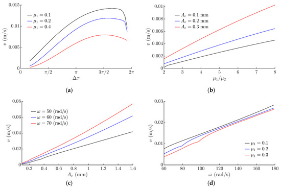 Mean displacement velocity depending on: (a) Δτ when µ2 = µ1/8, g = 9.81 m/s2, Ae = 0.28 mm, ω = 62.8 rad/s, ε = π/2, ϕ = 0; (b) µ1/µ2 when µ1 = 0.1, g = 9.81 m/s2, ω = 62.8 rad/s, ε = π/2, ϕ = 0, Δτ = π/6; (c) circular excitation amplitude Ae when µ1 = 0.1, µ2 = µ1/8, g = 9.81 m/s2, ε = π/2, ϕ = π/2, Δτ = 2π/3; (d) circular excitation frequency ω when µ2 = µ1/8, g = 9.81 m/s2, ε = π/2, Ae = 0.28 mm, ϕ = π/2, Δτ = 2π/3.