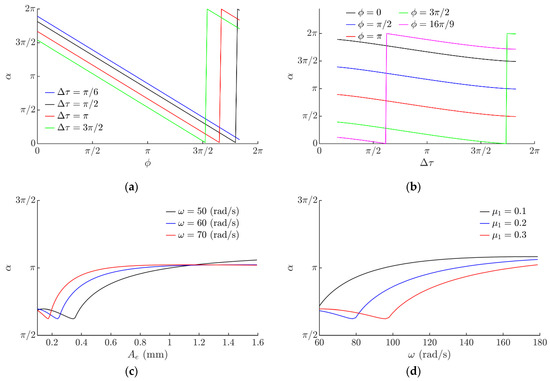 The displacement angle α depending on: (a) phase shift ϕ when µ1 = 0.1, µ2 = µ1/8, g = 9.81 m/s2, Ae = 0.28 mm, ω = 62.8 rad/s, ε = π/2; (b) Δτ when µ2 = µ1/8, g = 9.81 m/s2, Ae = 0.28 mm, ω = 62.8 rad/s, ε = π/2; (c) excitation amplitude Ae when µ1 = 0.1, µ2 = µ1/8, g = 9.81 m/s2, ε =π/2, ϕ = π/2, Δτ = 2π/3; (d) excitation frequency ω when µ2 = µ1/8, g = 9.81 m/s2, ε = π/2, Ae = 0.28 mm, ϕ = π/2, Δτ = 2π/3.