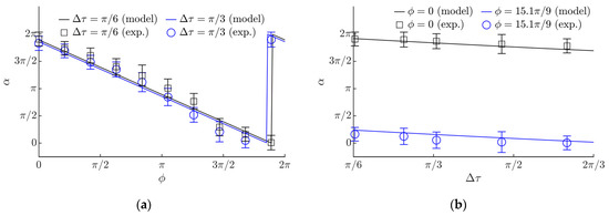 Experimental and modeling results of α depending on: (a) the phase shift ϕ when µ1 = 0.1, µ2 = µ1/8, g = 9.81 m/s2, Ae = 0.28 mm, ω = 62.8 rad/s, ε = π/2; (b) Δτ when µ1 = 0.1, µ2 = µ1/8, g = 9.81 m/s2, Ae = 0.28 mm, ω = 62.8 rad/s, ε = π/2.