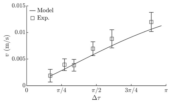 Experimental and modeling results of v vs. Δτ are shown in Figure 10. In the analyzed range, an increase in the mean displacement velocity v was observed as Δτ was increasing. A comparison between the modeling and the experiments also showed a good agreement. This confirms the theoretical findings and demonstrates how the mean displacement velocity depends on the level of the system asymmetry.