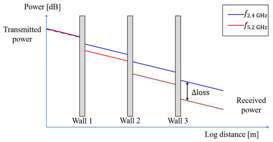 where is the path-loss exponent, and is the attenuation caused by the v-th wall in the propagation path. Focusing on the fact that the wall attenuation differs for each frequency band, the NLOS mode can be estimated. Figure 1 conceptually represents the attenuation tendency of the walls for two frequency bands. In free space, the attenuation in two bands is similar, but the difference in attenuation between two bands increases as there are more obstacles since the attenuation in 5.2 GHz is larger than that in 2.4 GHz for obstacles. In Figure 1, the path loss is expressed according to the number of walls as if the discrete steps are clearly separated; however, in a practical environment, this is not clear because the attenuation varies depending on the wall thickness, material, and map composition. The key point is that the attenuation in the 5.2 GHz band for the same geometric environment tends to be large at a certain rate compared to that in the 2.4 GHz band, and this can be an indicator of the severity of the NLOS condition. We assume that there is a nonlinear relation between the severity of the NLOS condition and the difference in attenuation between two bands.