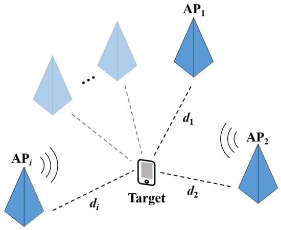 In this study, we assumed a Wi-Fi communication environment that uses a dual-band frequency. As shown in Figure 2, when the RSS at the target point is measured by three or more APs, the RSS of the i-th AP is represented as , where and denote the RSS of 2.4 GHz and that of 5.2 GHz, respectively.