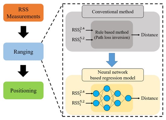 In addition, many approaches use deep learning techniques. Most localization algorithms that use deep learning can be regarded as data-driven methods, as they involve a neural network model that is trained with RSS input and the corresponding position labels. Replacing the entire localization process with a deep learning model causes problems regarding vulnerability to environmental changes, similarly to fingerprint-based methods. In this study, we propose a hybrid approach, which applies data-driven deep learning to only the ranging part of a model-based localization algorithm. By performing nonlinear regression using a neural network for the dual-band RSS, the ranging accuracy was significantly improved compared to that of the rule-based method. In addition, the proposed localization method has the advantage of being robust against changes in the AP locations and spatial structure. A ray-tracing method was used to get the channel data for a complex NLOS environment, and the ranging performance of the proposed dual-band RSS was evaluated and compared to that of existing methods. A comparison with existing methods using single-band RSS or rule-based ranging showed the advantages of the proposed method in terms of positioning accuracy. In addition, changes in the neural network structure of the deep regression model were analyzed.