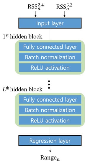 In this study, we propose a deep regression model for dual-band RSS ranging. The model’s structure is shown in Figure 4. The input of the model is the dual-band RSS vector, . The model has several hidden blocks, each of which is composed of a fully connected (FC) layer, a batch normalization layer, and a rectified linear unit (ReLU) activation function. The FC layer is a structure in which one node is connected to all other nodes in the adjacent layer. It allows for nonlinear regression along with a nonlinear activation function. Although the FC layer is simple and powerful, it is vulnerable to overfitting. To solve this problem, a batch normalization layer was inserted into each hidden block. The use of the batch normalization layer mitigates internal covariate shift phenomenon, which is the changes in the input data distribution affect the training procedure. Typically, batch normalization makes the neural network more stable and prevents the overfitting problem and increases the learning efficiency [].