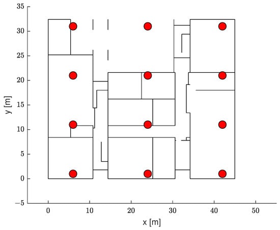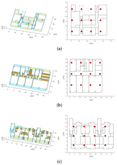 The proposed scheme assumes the installation of APs and the use of two frequency bands in an indoor environment. For the simulation, a geometry-based channel was created by using a ray-tracing method with real spatial information [,]. Three sites with different materials and structures were investigated. Figure 5 represents the 3D views and floor plans of the three sites, where (a) and (b) are academic buildings (INMC and ASRI on the Seoul National University campus), and (c) is an apartment building. The locations of the APs on each floor plan are marked with red circles. The height of the APs was set to 1.5 m for each map. The Tx power was assumed to be 0 dBm, and the center frequency was set to 2.4 or 5.2 GHz.