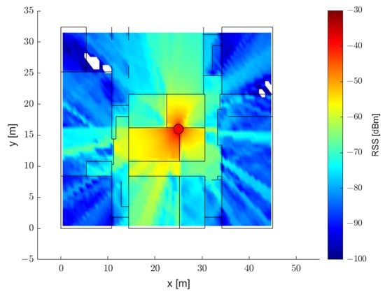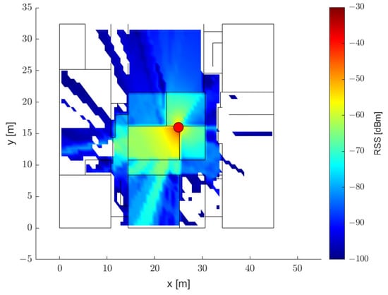 Indoor localization methods that use RSS can be divided into two groups: fingerprint-based methods and range-based methods []. The fingerprint-based methods are based on a pattern-matching scheme. The RSS patterns from multiple access points (APs) at a specific location were recorded in the offline stage. In the online stage, the measured RSS pattern is compared with a recorded database to match a location. The offline stage requires time and effort for site surveys and is vulnerable to channel changes (e.g., AP location changes and furniture structure changes) []. Range-based localization methods estimates the distance between individual APs and a target node and specify a location through geometric inference. The main problem in range-based localization using RSS is the ranging error. The RSS ranging error result from the non-line-of-sight (NLOS) channel condition, antenna direction, and time-varying obstruction by crowds. Among these, the NLOS effect of indoor wall structures and obstacles is the most important factor. The shadowing effect caused by wall structures makes RSS ranging difficult, resulting in position inaccuracy [,].