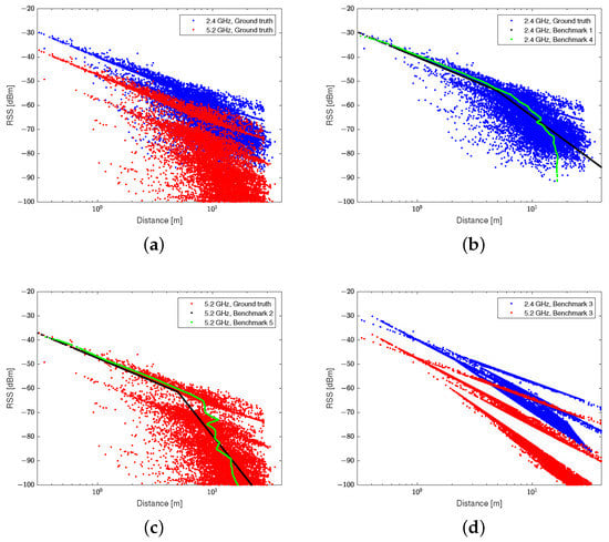 (a) Distance–RSS data of the ground truth, and the regression results of the (b) 2.4 GHz, (c) 5.2 GHz, and (d) dual-band frequencies.