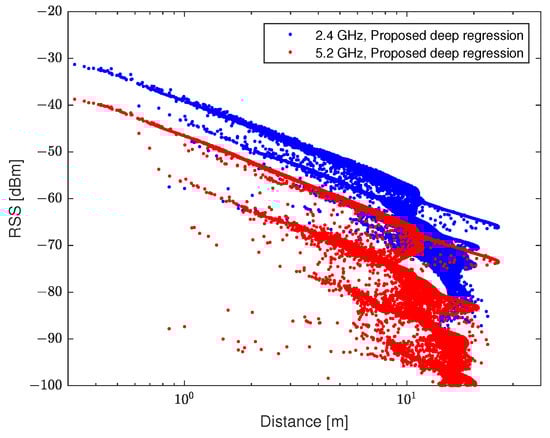 Figure 6 and Figure 7 represent the RSS distribution according to the center frequency when only one specific AP is considered in the map shown in Figure 5a. Similarly to the theoretical inference, the attenuation in the 5.2 GHz band is larger than that in the 2.4 GHz band, and the difference in attenuation between the two frequency bands is verified to be larger under harsh NLOS conditions. For the evaluation of the ranging and positioning performance, the RSS values from 12 APs were recorded at points on a uniform grid approximately 1 m apart from each other for the three sites. The total number of points evaluated for the three sites was 11,474, and the number of RSS–distance pairs satisfying the noise floor condition was 74,912. All measurement points were split into sets with the following proportions: 70% for the training set, 15% for the validation set, and 15% for the test set; then, the deep regression model was trained and evaluated by using the dual-band RSS and distance pairs.