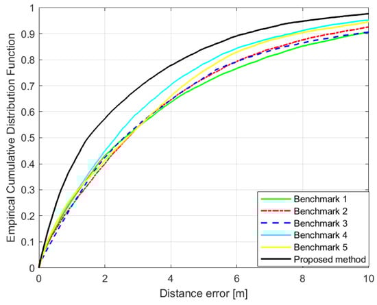 Figure 10 shows the empirical cumulative distribution function (ECDF) of the ranging errors according to the ranging methods. The key indicators of the results are summarized in Table 1. In terms of the error between the estimated distance and the actual distance, the proposed method showed the best performance with a median error of 1.49 m. This is approximately 36.1% lower than those of the benchmark techniques. The benchmark results using the single-band RSS showed similar performances. This is because there is a limit to the information that can be obtained from the single-band RSS. The results of Benchmark 3, which used dual-band RSS, did not show good ranging accuracy for the test environment. This is due to the limitation of the rule-based ranging method in that it is difficult to reflect various cases in an indoor environment with only three discrete channel states. Although the ranging accuracy improved in some cases, the statistical performance of the total test samples was degraded because ranging errors were amplified by misclassification in several other cases.