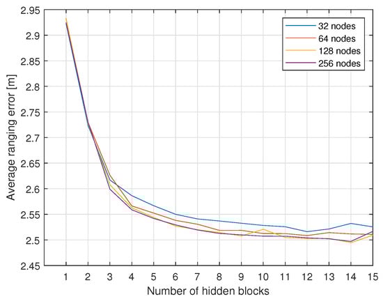 The hyperparameters of the proposed deep regression model are adjustable variables. There is a trade-off between the performance and computational complexity of the neural network. We evaluated the average value of the ranging error by changing the number of nodes and the number of hidden blocks, and Figure 11 shows the results. The ranging error is saturated to about 2.5 m, and having too many hidden blocks for the small number of nodes decreases the ranging accuracy. The computational complexity of the proposed model structure can be expressed as . Therefore, as the structure becomes more complex, the computation increases excessively compared to the performance gain. In this paper, we propose the use of 64 nodes in each layer and eight hidden blocks, where the ranging accuracy is greater than the 95th percentile value among the evaluated models, and the computational complexity is only 3.3% compared to the model with the highest ranging accuracy.