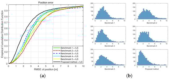 Empirical cumulative distribution function (a) and histogram (b) of the positioning error.