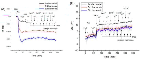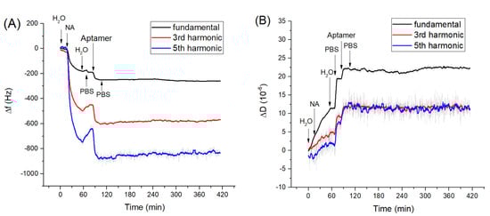 The kinetics of the changes of (A) fundamental frequency, 3rd and 5th harmonic frequencies and (B) dissipation vs. time following the addition of neutravidin (NA, 125 µg/mL)) and DNA aptamers (0.5 µM). The moment of addition of various compounds as well as washing of the surface by water and phosphate-buffered saline (PBS) are shown by arrows.