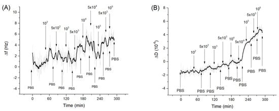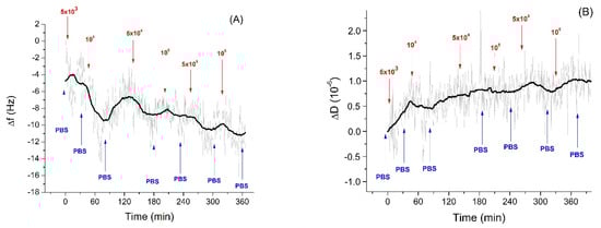 In the study of specific interaction of Listeria innocua with sensing layer we ensured the stability of the resonant frequency within 1–2 h under the control of the temperature 20 ± 0.5 °C. As soon as the frequency stabilized, the Listeria innocua was added step-wise at the sensing surface. The kinetics of the frequency changes following the addition of Listeria innocua at the surface of the QCM aptasensor is presented in Figure 3A. Addition of bacteria in the range of 5 × 103–106 CFU/mL resulted in the frequency decrease and in a slight increase of dissipation (Figure 3B). It is also seen that the noises in the frequency changes are around 2 Hz, which is comparable with mean frequency changes following the addition of the smallest applied concentration of Listeria innocua, 5 × 103–104 CFU/mL. Despite the tendency of frequency decrease and dissipation increase being obvious, the question arises as to whether this decrease is due to specific interaction of the bacteria with the sensing surface or due to a certain drift of the baseline. However, as can be seen from long-time kinetics of the frequency and dissipation changes (Figure 1), these parameters are rather stable. In the case of the frequency we observed only a slight increase of this value. Only after 240 min. of measurements did the slight decrease of frequency occur (Figure 1A).