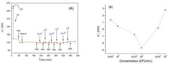 (A) the kinetics of the changes of penetration depth during formation of the aptamer layer and addition of Listeria innocua (in CFU/mL). (B) Changes in penetration depth depending on applied bacteria concentration in logarithmic scale. Addition of various compounds and washing the surface by water or PBS is shown by arrows.